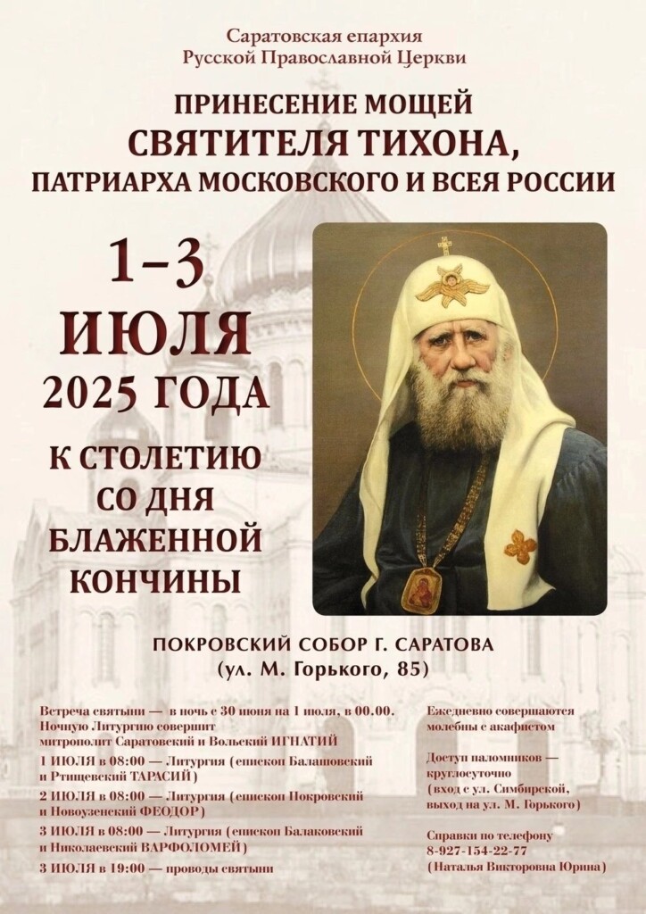 1-3 июля в Саратов будет принесен ковчег с мощами святителя Тихона, Патриарха Московского и Всероссийского, из Донского мужского монастыря. 7 апреля этого года отмечалось 100-летие со дня его блаженной кончины, и во всех епархиях Русской Православной Церкви в течение этого года будут проводиться мероприятия в память о нем.