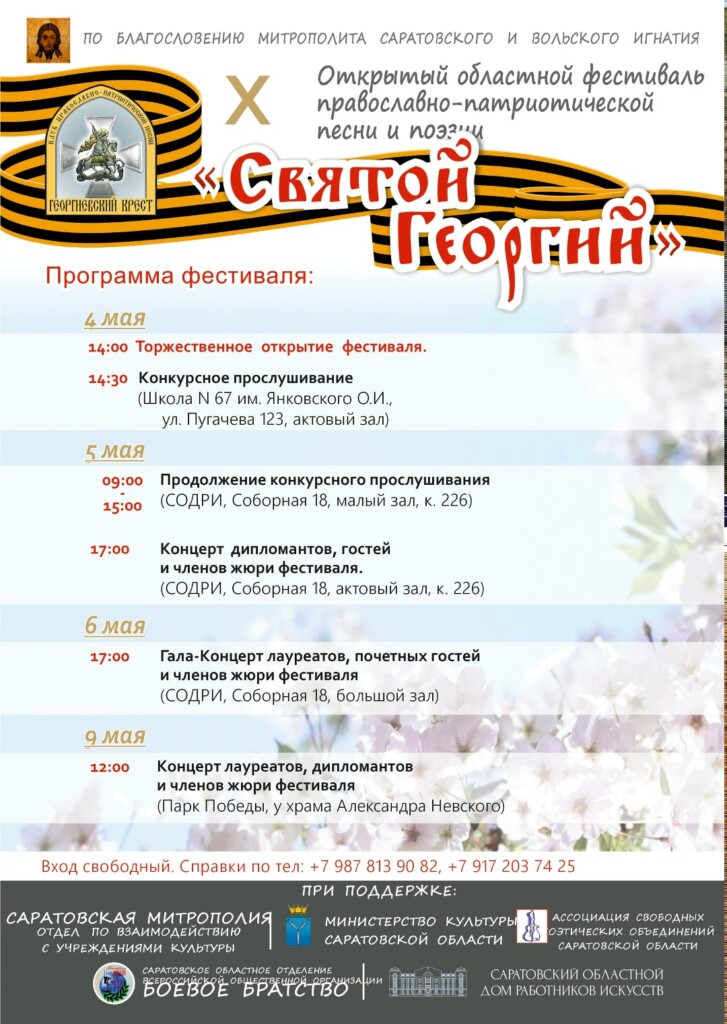 С 4 по 9 мая в Саратове пройдет Х открытый областной фестиваль православно-патриотической песни и поэзии «Святой Георгий».